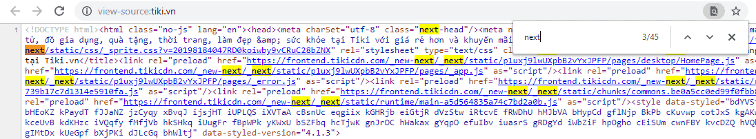Đây là hình ảnh mà mình nhận biết Tiki sử dụng NextJS để render code ReactJS từ phía Server.