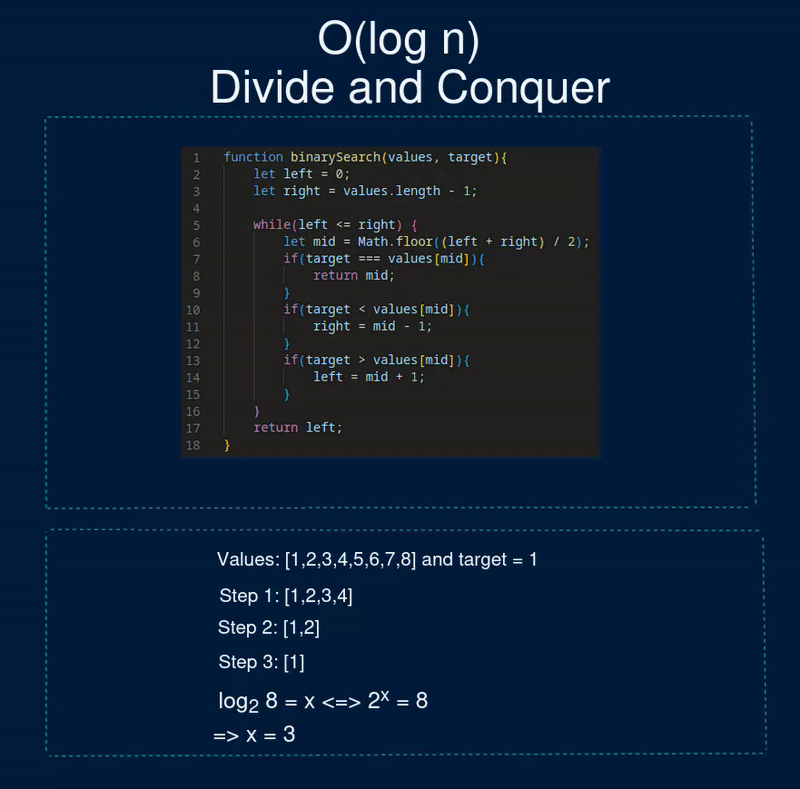 Ở ví dụ bên dưới mình có thuật toán Binary Search với input array đầu vào đã được sắp xếp theo thứ tự tăng dần, ở mỗi lần lặp thì thuật toán sẽ giảm đi một nửa số lượng phần tử, chia nhỏ mảng làm 2 phần, loại bỏ 1 phần và tính toán tiếp trên phần còn lại của mảng. Trong trường hợp tốt nhất thì giá trị cần tìm sẽ nằm ở giữa mảng, nhưng trong trường hợp xấu nhất thì nó sẽ nằm ở đầu hoặc cuối mảng. Giả sử mình đi tìm số 1 trong mảng, nó là con số ở đầu mảng tương ứng với trường hợp xấu nhất. Như đã thấy mình sẽ mất 3 lần lặp để có thể có thể tìm được giá trị trong mảng có 8 phần tử.