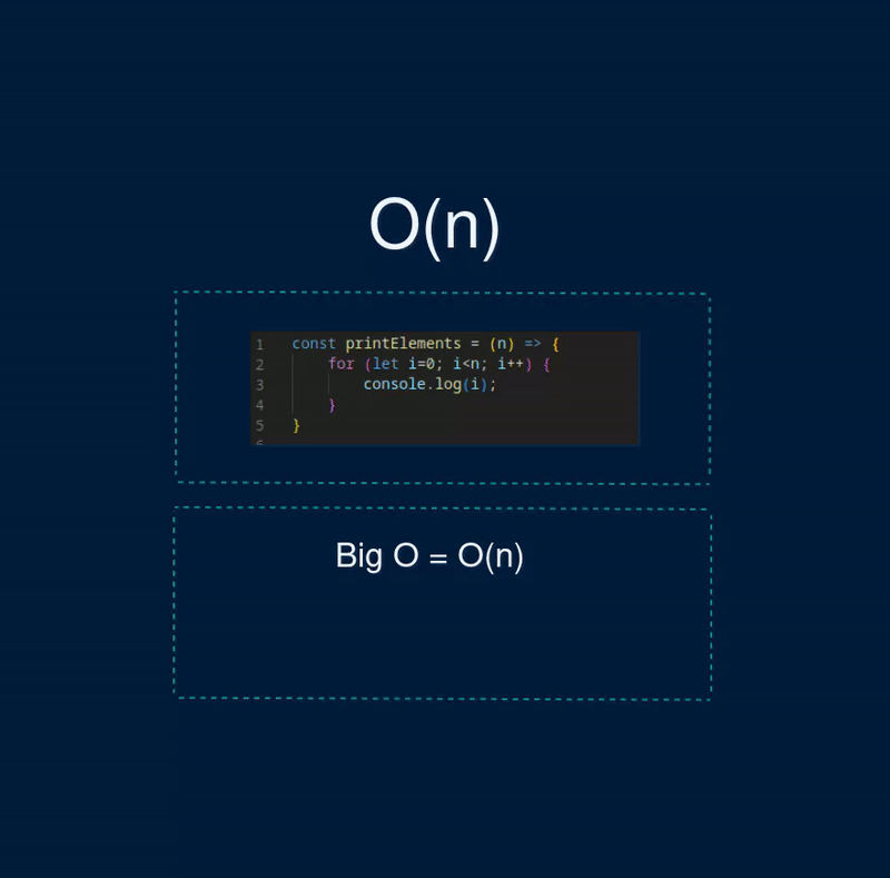 Giả sử mình có 1 hàm printElements như hình bên dưới, hàm này phải lặp n lần để in ra các giá trị i, vậy độ phức tạp của thuật toán Big O của hàm này sẽ là O(n)