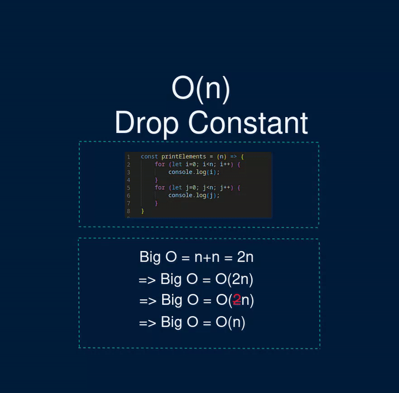 Ngoài ra trong Big O còn có khái niệm Drop Constant, nó sẽ loại bỏ hằng số khi tính Big O. Ví dụ bên dưới, mình có 2 vòng lặp tách biệt nhau và mỗi vòng lặp chạy n lần, như vậy mình sẽ có phép cộng: